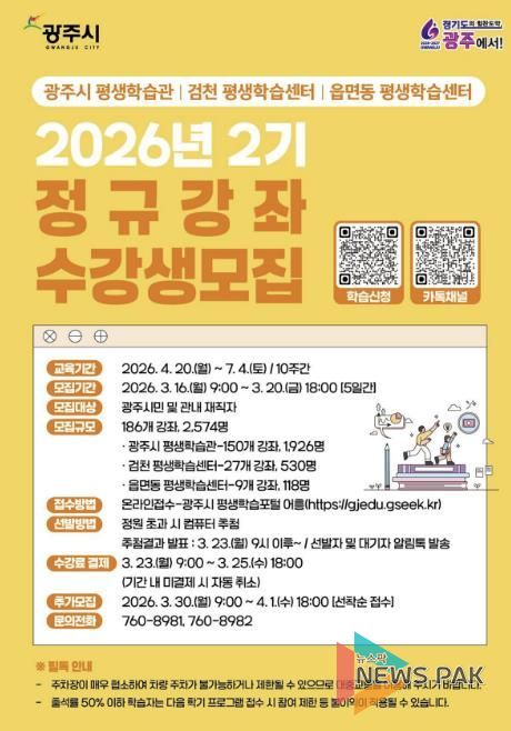 뉴스팍 이화형 기자 | 광주시는 오는 16일부터 20일까지 2026년 제2기 평생학습 프로그램 수강생을 모집한다고 6일 밝혔다.