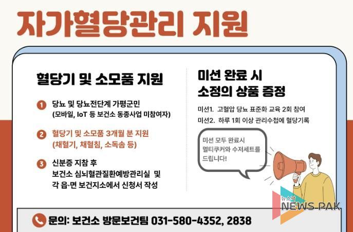 뉴스팍 배상미 기자 | 가평군보건소가 당뇨병 예방과 체계적인 관리를 돕기 위한 자가혈당 관리 지원사업을 본격 추진한다.