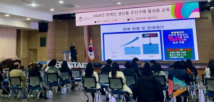 뉴스팍 이소율 기자 | 평택시는 지난 5일 시청 본관 2층 대회의실에서 평택시 공무원을 대상으로 '2026년 장애인생산품 우선구매 활성화 교육’을 실시했다.