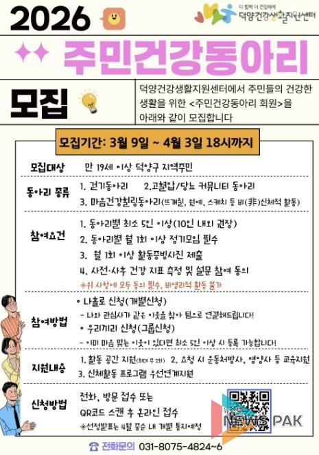 뉴스팍 배상미 기자 | 고양특례시 덕양건강생활지원센터가 지역주민이 주도하는 건강 행복 도시조성을 위해 ‘주민건강동아리’참여자를 모집한다.