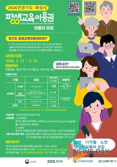 뉴스팍 류은정 기자 | 화성특례시는 평생학습 소외계층의 학습권을 보장하고 교육격차를 완화하기 위해 ‘2026년 평생교육이용권 지원사업’ 이용자 1차 모집을 오는 3월 11일부터 31일까지 실시한다고 밝혔다.