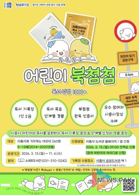 뉴스팍 배상미 기자 | 시흥시 소래빛도서관은 오는 3월 15일부터 관내 5~13세 어린이 260명을 대상으로 독서 기록장을 배부하고, 우수 참여자 8명에게 시흥시장상을 수여하는 독서사업 ‘2026 어린이 북쳠쳠 독서성장 1000+’를 운영한다.