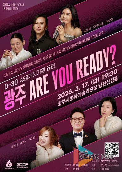 뉴스팍 이화형 기자 | 광주시문화재단은 오는 3월 17일 오후 7시 30분, 광주시문화예술의전당 남한산성홀에서 ‘제72회 경기도체육대회 2026 광주 및 제16회 경기도장애인체육대회 2026 광주 D-30 성공기원 공연’ '광주! ARE YOU READY?'’를 개최한다.