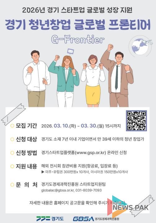뉴스팍 배상미 기자 | 경기도와 경기도경제과학진흥원은 도내 청년 창업가들의 글로벌 시장 진출의 시작을 돕는 ‘경기 청년창업 글로벌 프론티어(G-Frontier)’ 참여기업 20개사를 오는 30일까지 모집한다.