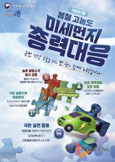뉴스팍 배상미 기자 | 시흥시는 연중 초미세먼지 농도가 가장 높고 ‘나쁨(초미세먼지 35㎍/㎥ 이상)’ 일수가 빈번하게 발생하는 3월 한 달을 ‘초미세먼지 봄철 총력대응 기간’으로 정하고, 고농도 미세먼지 저감을 위한 대응을 강화한다.