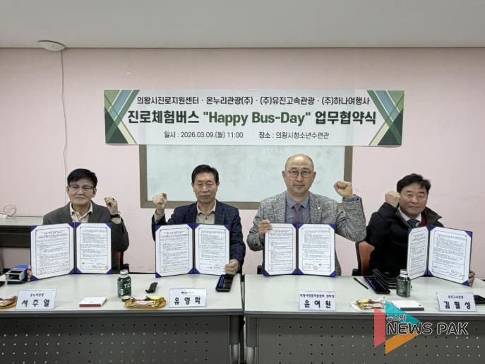 뉴스팍 배상미 기자 | 의왕시청소년재단 산하 의왕시진로지원센터 ‘꿈터’가 청소년들의 진로 탐색을 지원하기 위해 3월 9일 관내 운수업체와 ‘진로체험버스’ 운영을 위한 업무협약(MOU)을 체결했다.