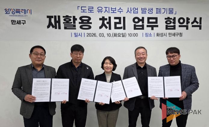 뉴스팍 류은정 기자 | 화성특례시 만세구가 도로 유지보수 과정에서 발생하는 폐기물을 효율적으로 처리하고 자원 재활용을 확대하기 위해 관내 아스콘 생산 업체와 ‘폐아스콘 재활용 처리 협약’을 체결했다.