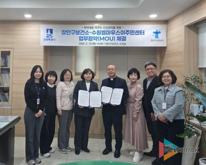 뉴스팍 배상미 기자 | 수원시 장안구보건소와 수원 엠마우스는 10일 장안구보건소에서 업무협약을 체결하고, 취약계층 이주민 건강관리 지원을 위해 협력하기로 했다.