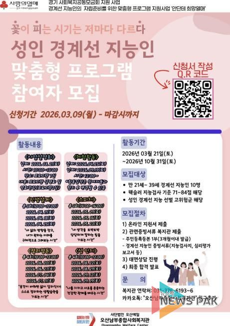 뉴스팍 이소율 기자 | 오산남부종합사회복지관은 지역사회 내 복지 사각지대에 놓인 성인 경계선 지능인을 위한 맞춤형 지원 프로그램 ‘꽃·피·다’를 오는 4월 11일부터 운영한다고 밝혔다.