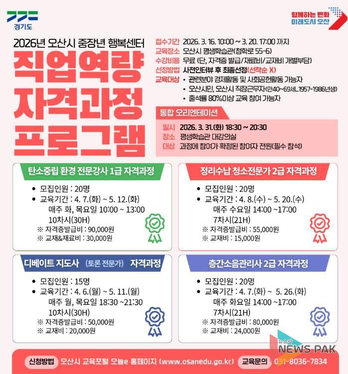 뉴스팍 이소율 기자 | 오산시는 중장년층의 경제활동 참여 확대와 사회공헌 기회 제공을 위해 ‘2026년 오산시 중장년 행복센터 직업역량 자격과정 프로그램’ 수강생을 모집한다고 밝혔다.