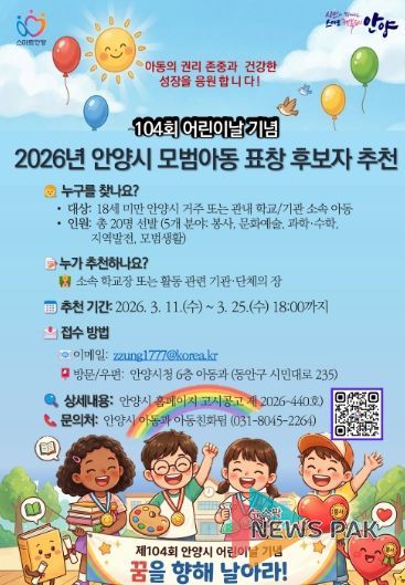 뉴스팍 배상미 기자 | 안양시는 어린이날을 맞아 다양한 분야에서 모범이 되는 아동을 발굴하기 위해 ‘2026년 모범아동 유공 표창’ 후보자를 11일부터 25일까지 추천받는다고 11일 밝혔다.
