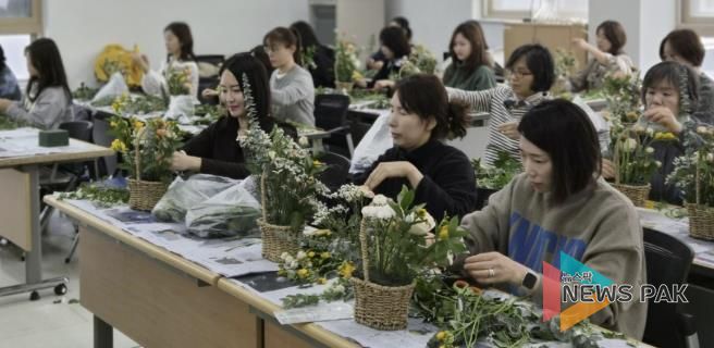 모집 정원은 20명이었으나 주민들의 높은 관심으로 23명이 신청해 초과 모집 형태로 진행됐으며, 참여 주민들은 다양한 꽃을 활용한 꽃바구니 만들기를 체험하며 즐거운 시간을 보냈다.