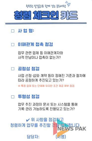 체크인 카드에는 ▲이해관계자와의 사적 접촉 여부 ▲사업 추진 과정의 공정성 ▲부당청탁 발생 여부 ▲업무 추진 과정의 기록 및 관리 가능 여부 등 업무 추진 시 점검해야 할 청렴 항목이 포함돼 있으며, 담당자가 업무 시작 단계에서 간단히 확인하도록 구성됐다. 특히 문화관광 분야는 민간단체 및 업체와의 협업이 많은 만큼, 이번 시책을 통해 업무 초기 단계에서 청렴 위험 요소를 점검함으로써 부패 발생 가능성을 사전에 예방하는 데 목적이 있다.