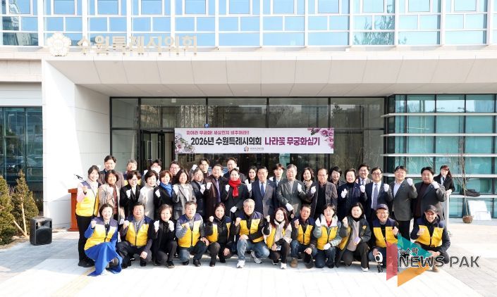 뉴스팍 배상미 기자 | 수원특례시의회는 12일 의회 청사 정문 앞에서 '2026년 나라꽃 무궁화 심기 행사'를 개최해 무궁화특화도시 수원의 위상을 알리고 나라꽃에 대한 시민적 관심을 높이는 시간을 가졌다.