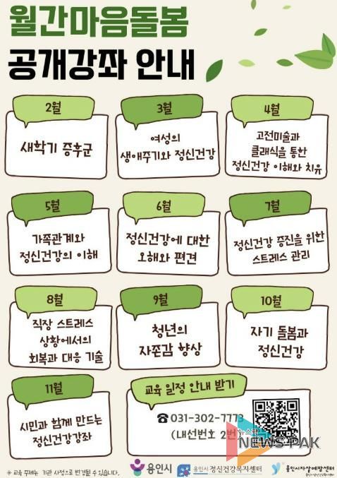 뉴스팍 배상미 기자 | 용인특례시는 용인시정신건강복지센터 주관으로 시민 정신건강 증진을 위한 ‘월간 마음돌봄 공개강좌’ 3월 과정을 19일 용인시정신건강복지센터 영덕분소에서 진행한다고 13일 밝혔다.