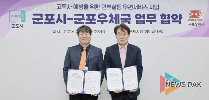 뉴스팍 배상미 기자 | 군포시는 3월 12일 군포시청에서 군포우체국과 사회적 고립가구 지원을 위한 ‘안부살핌 우편서비스’ 업무협약을 체결했다고 밝혔다.