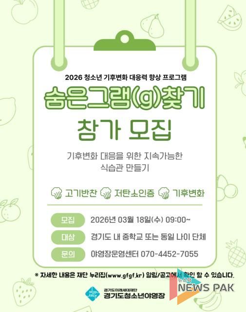 뉴스팍 배상미 기자 | 경기도미래세대재단은 18일부터 기후변화 대응 체험형 교육 ‘숨은 그램 찾기’ 참가 단체·학교를 모집한다.