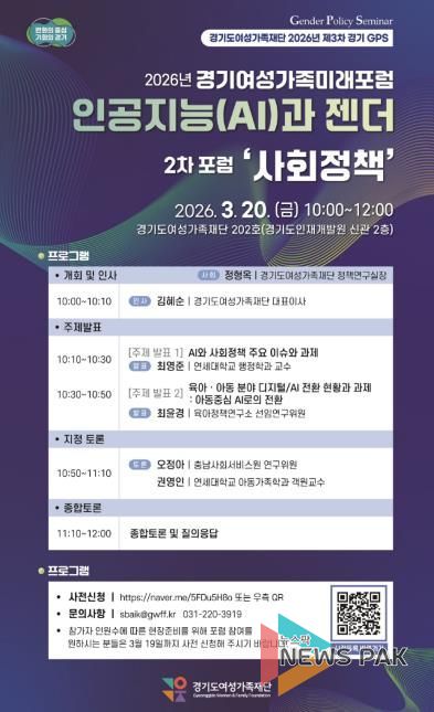 뉴스팍 배상미 기자 | 경기도여성가족재단은 20일 ‘인공지능(AI)과 사회정책’을 주제로 경기여성가족미래포럼 2차 포럼을 개최한다.