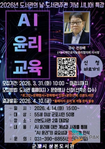 뉴스팍 배상미 기자 | 군포시 산본도서관은 오는 4월 14일, 디지털 사회 문제에 취약한 55세 이상 시민 50명을 대상으로 ‘시니어 AI 윤리 교육’ 특별 강연을 개최한다고 밝혔다. 이번 강연은 제62회 도서관 주간을 맞아 지역 내 도서관의 사회적 역할을 강화하고 시니어 세대의 디지털 문해력을 높이기 위해 마련됐다.