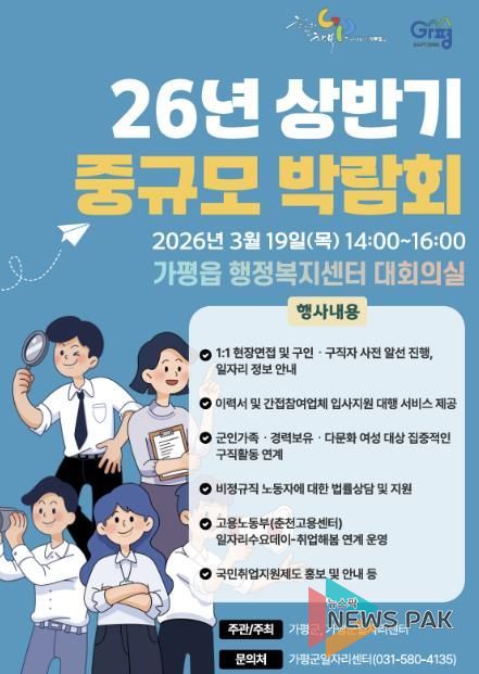 뉴스팍 배상미 기자 | 가평군은 19일 오후 2시부터 4시까지 가평읍 행정복지센터 대회의실에서 ‘2026년 상반기 1차 중규모 채용박람회’를 개최한다고 밝혔다.