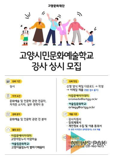 뉴스팍 배상미 기자 | 고양문화재단은 시민들에게 참신하고 수준 높은 문화예술교육 서비스를 제공하기 위해 ‘고양시민문화예술학교’(아람문예아카데미 및 어울림문화학교) 강사 인력풀(POOL)을 상시 모집한다.