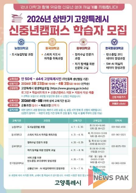 뉴스팍 배상미 기자 | 고양특례시는 ‘2026년 고양시 신중년캠퍼스’ 상반기 교육과정 학습자 180명을 오는 3월 23일부터 모집한다.