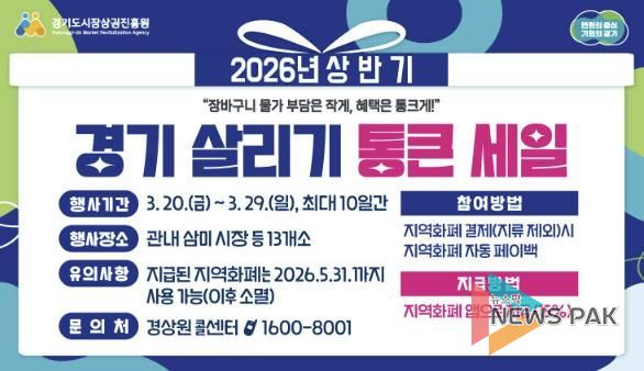 뉴스팍 배상미 기자 | 시흥시는 고물가로 위축된 민생경제에 활력을 불어넣고 소상공인의 매출 증대를 돕기 위해 오는 3월 20일부터 29일까지 관내 전역에서 ‘2026년 상반기 경기 살리기 통큰 세일’을 개최한다.