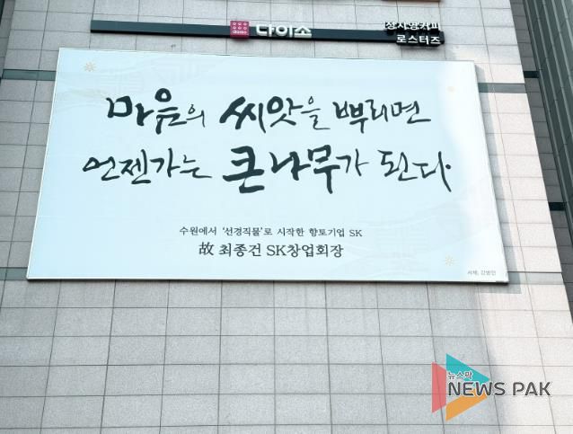 뉴스팍 배상미 기자 | 수원특례시는 SK 창업주 고 최종건 회장과 고 최종현 선대회장의 어록을 담은 ‘2026 수원희망글판’ 문안을 에이케이(AK)플라자 수원점 외벽과 아이비케이(IBK)기업은행 동수원지점 외벽에 게시했다.