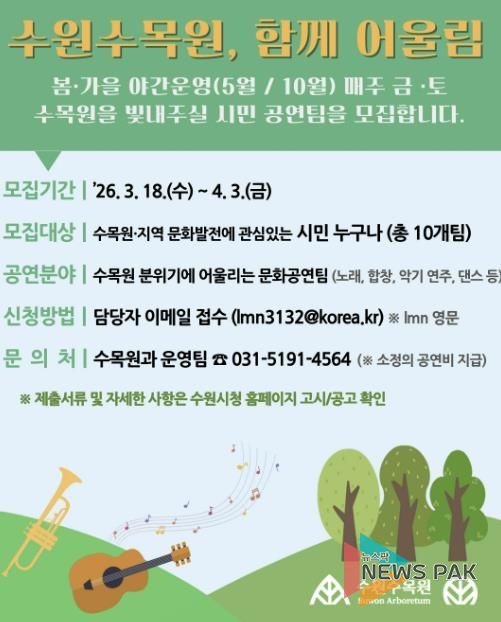 뉴스팍 배상미 기자 | 수원특례시가 수원수목원에서 열리는 시민 참여 문화공연 ‘수원수목원, 함께 어울림’에 참여할 시민 공연팀을 4월 3일까지 모집한다.
