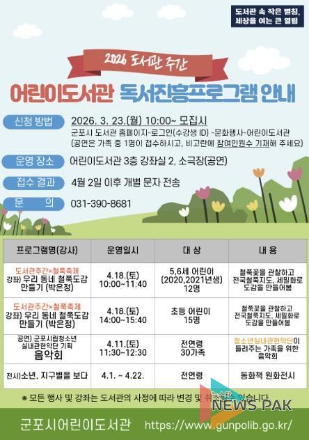 뉴스팍 배상미 기자 | 군포시 어린이도서관은 4월 도서관주간을 맞아 어린이와 가족이 함께 즐길 수 있는 다양한 독서문화 프로그램을 운영한다고 밝혔다.