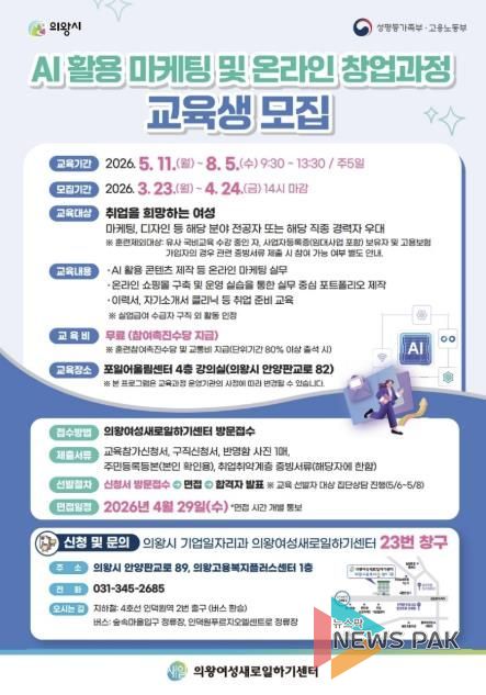 뉴스팍 배상미 기자 | 의왕여성새로일하기센터는 마케팅 사무원 분야 취업과 온라인 창업을 희망하는 여성 시민을 대상으로 ‘인공지능 활용 마케팅 및 온라인 창업과정’ 교육생을 모집한다.