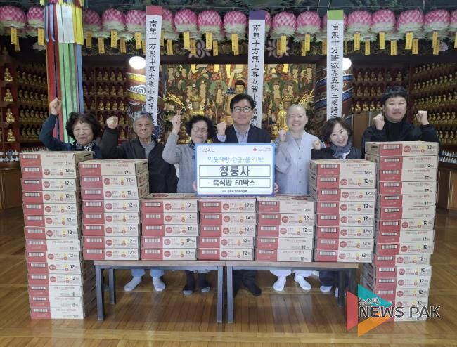 뉴스팍 배상미 기자 | 가평 청룡사는 최근 지역의 소외된 이웃들에게 도움이 되길 바라는 마음으로 청평면 행정복지센터에 즉석밥 60박스를 기탁했다.