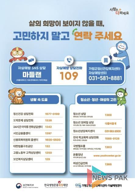 뉴스팍 배상미 기자 | 가평군정신건강복지센터와 자살예방센터가 봄철 자살 위험 증가에 대응해 집중 예방 활동에 나섰다.