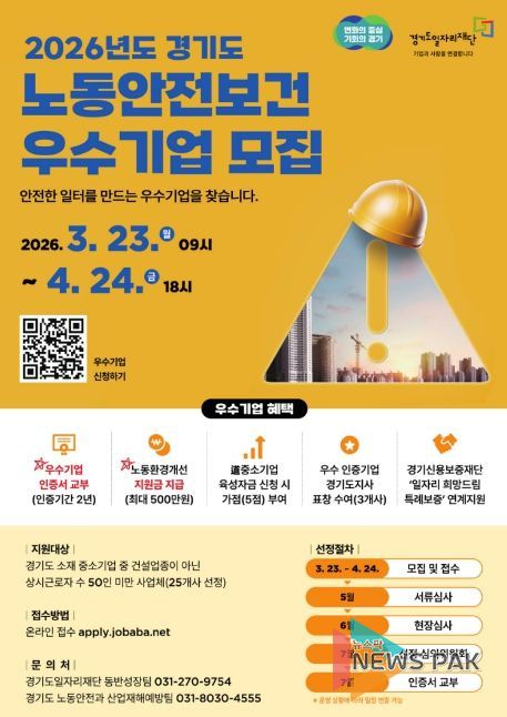 뉴스팍 배상미 기자 | 경기도와 경기도일자리재단은 산업재해 예방과 안전한 일자리 환경 조성을 위해 ‘2026년 경기도 노동안전보건 우수기업 인증사업’ 참여기업을 오는 4월 24일까지 모집한다.