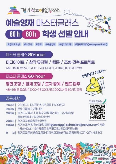 뉴스팍 배상미 기자 | 경기도교육청이 미래 예술 인재 성장을 지원하는 전문 예술영재교육 프로그램인 ‘2026 예술영재 마스터 클래스 80·60-hour’참여 학생을 오는 26일까지 모집한다.