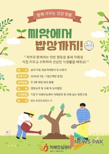 뉴스팍 배상미 기자 | 용인특례시 기흥구보건소 치매안심센터는 3월 말부터 7월까지 치매안심센터 2층 테라스에서 경증 치매 어르신을 대상으로 치유농업 활동 특화 프로그램 ‘씨앗에서 밥상까지!’를 운영한다고 24일 밝혔다.