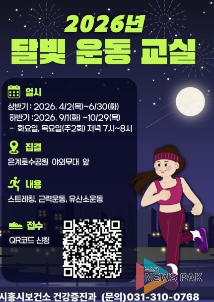 뉴스팍 배상미 기자 | 시흥시는 시민들의 건강한 생활습관 형성과 신체활동 증진을 위해 오는 4월 2일부터 은계호수공원 야외무대 앞에서 ‘2026년 달빛 운동 교실’을 운영한다.