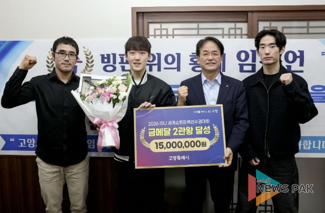 뉴스팍 배상미 기자 | 고양특례시는 캐나다 몬트리올에서 열린 ‘2026 ISU 세계 쇼트트랙 선수권대회’에서 개인전 2관왕을 달성하며 세계 최정상의 기량을 입증한 빙상팀 임종언 선수를 지난 23일 초청해 격려 오찬·간담회를 진행했다.
