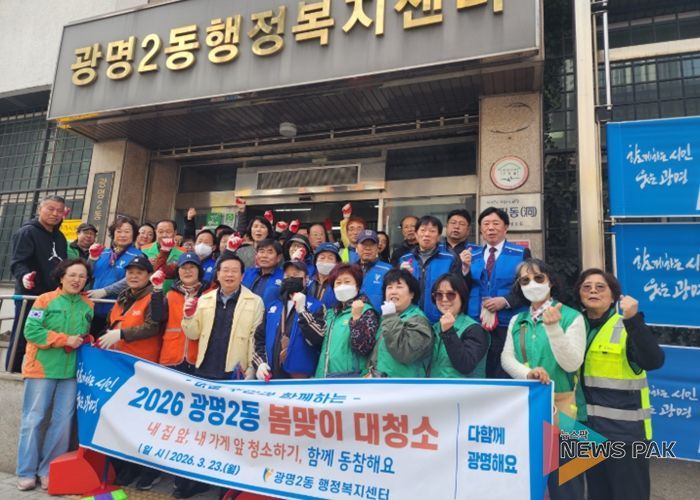 뉴스팍 배상미 기자 | 광명시 광명2동 행정복지센터는 지난 23일 깨끗하고 쾌적한 마을 환경 조성을 위해 주민자치회, 통장협의회 등 관내 유관단체원 50여 명과 함께 ‘2026년 봄맞이 대청소’를 실시했다.