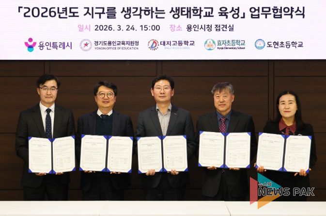 뉴스팍 배상미 기자 | 용인특례시는 24일 시청 접견실에서 용인교육지원청을 비롯해 3개 학교와 ‘지구를 생각하는 생태학교 육성사업’을 위한 협약을 맺었다.