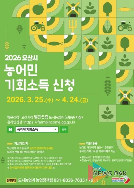뉴스팍 이소율 기자 | 오산시는 농업·농촌의 공익적 가치 보장과 농어촌 소멸위기 대응을 위해 ‘2026년 농어민 기회소득’ 신청·접수를 3월 25일부터 4월 24일까지 진행한다고 밝혔다.