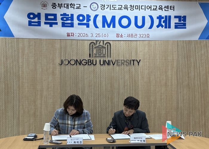 뉴스팍 배상미 기자 | 경기도교육청미디어교육센터가 25일 중부대학교 지역혁신중심대학지원사업단, 디지털미디어교육콘텐츠 교사연구협회인 ‘몽당분필’과 미디어교육 활성화를 위한 업무협약을 체결했다.