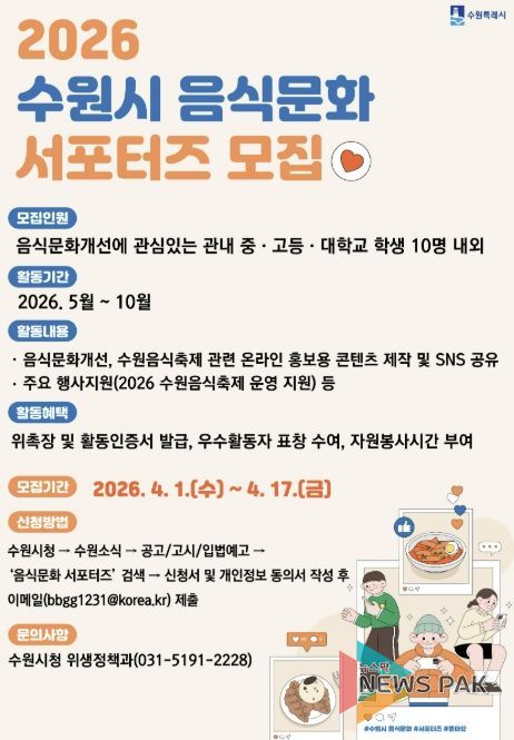 뉴스팍 배상미 기자 | 수원특례시는 ‘2026년 음식문화 서포터즈’로 활동할 중·고등·대학생을 4월 17일까지 모집한다.