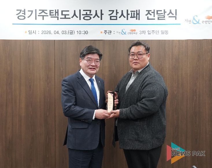 뉴스팍 배상미 기자 | 경기주택도시공사(GH)가 수원 본사에서 다산자연앤이편한세상3차 아파트 입주민들로부터 원활한 조기 분양전환 노력과 제도적 지원에 따른 공로를 인정받아 감사패를 받았다고 3일 밝혔다.