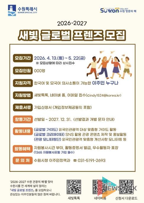 뉴스팍 배상미 기자 | 수원특례시가 ‘2026~2027 수원 방문의 해’를 맞아 5월 22일까지 수원시를 전 세계에 알릴 ‘새빛 글로벌 프렌즈’를 모집한다.