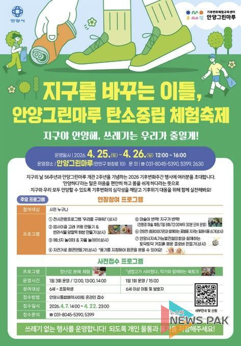뉴스팍 배상미 기자 | 안양시는 제56회 지구의 날(4월 22일)을 맞아 기후위기 대응과 탄소중립 생활 실천 확산을 위한 기후변화주간(4월20~26일)을 운영하고 있다고 22일 밝혔다.