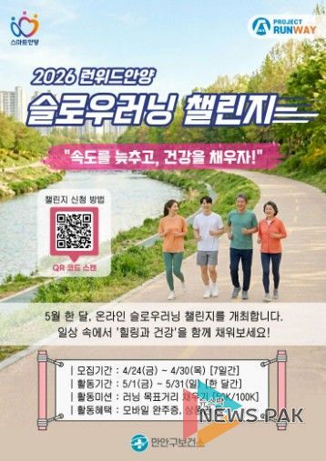 뉴스팍 배상미 기자 | 안양시는 시민들의 일상 속 신체활동을 독려하고 건강한 운동 습관 형성을 돕기 위해 오는 5월 한 달간 ‘2026 런위드안양 슬로우러닝 챌린지’를 개최한다고 23일 밝혔다. 참가자 모집은 이달 24일부터 30일까지 진행된다.