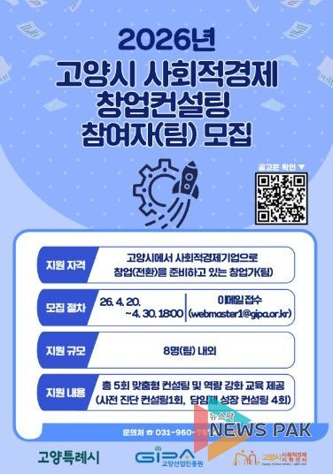 뉴스팍 배상미 기자 | 고양산업진흥원이 운영하는 고양시사회적경제지원센터가‘2026년 고양시 사회적경제 창업컨설팅 사업’에 참여할 예비 창업자(팀)을 오는 30일까지 모집한다.