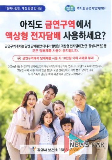 뉴스팍 배상미 기자 | 광명시 보건소는 시민 건강을 증진하고 간접흡연 피해를 막기 위해 오는 5월 15일까지 ‘2026년 담배 정의 확대에 따른 금연구역 합동 점검·단속’을 한다.