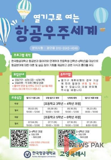 프로그램은 △열기구로 여는 항공우주의 세계 △패러글라이딩으로 여는 하늘 △천체관측 우주탐험 등 총 3개 과정으로, 초등학교 저학년(3~4학년)과 고학년(5~6학년)으로 나눠 운영된다. 각 과정은 한국항공대에서 주 1회씩 4주간 진행된다.